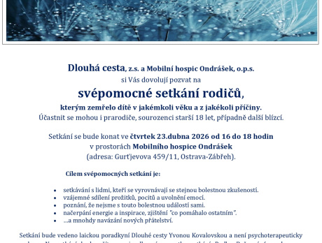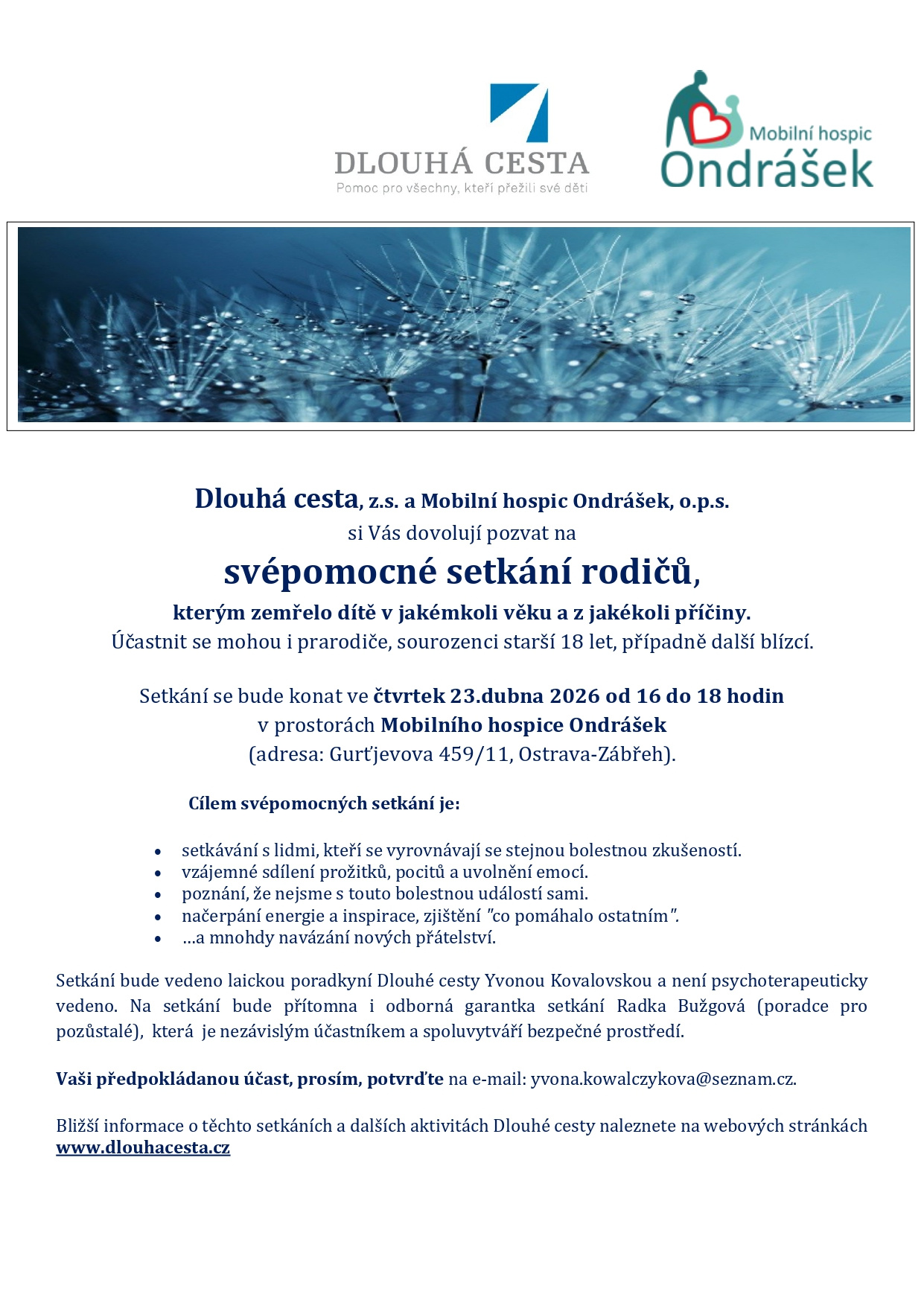 Setkání se bude konat ve čtvrtek 23. dubna 2026 od 16 do 18 hodin v Mobilní hospici Ondrášek, Gurťjevova 459/11, Ostrava-Zábřeh.